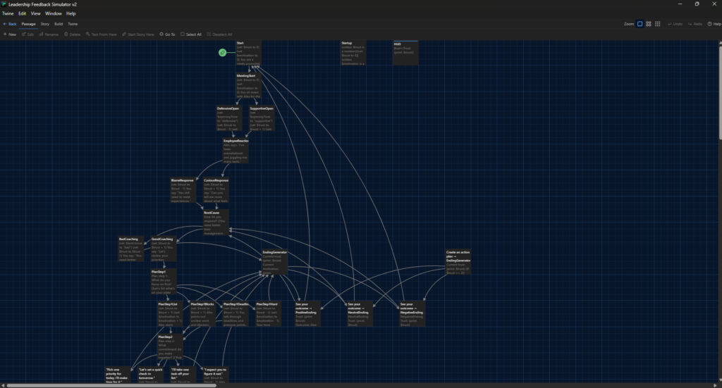 This is a working Twine prototype. Click through the conversation and try different responses to see how the scenario changes.